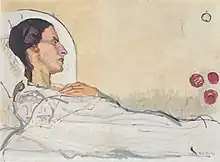 In 1908, Hodler met Valentine Godé-Darel, who became his mistress, although he continued to live with his second wife.[14] In 1913, Godé-Darel was diagnosed with a gynecological cancer, and the many hours Hodler spent by her bedside resulted in a remarkable series of paintings documenting her decline from the disease.[15] In January 1914, three months after the birth of their daughter, Pauline, Godé-Darel was subjected to an operation for the cancer. In June 1914, she underwent a second operation.[16] Her death in January 1915 affected Hodler greatly. He occupied himself with work on a series of about 20 introspective self-portraits that date from 1916.