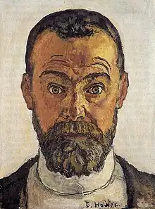 In 1880–81, Hodler painted Self-Portrait (The Angry One), in which his expression displayed exasperation at his continued poverty and lack of recognition.[5] It was ridiculed when displayed in Geneva, prompting Hodler's remark to a friend that the Swiss "will not understand me until they see I have been understood elsewhere".[5] He submitted the painting to the Paris Salon, where it was his first work accepted, although it was ignored by the critics.[5]
