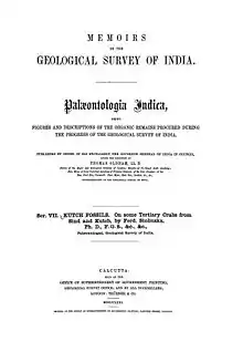 In 1862 Stoliczka joined the Geological Survey of India (GSI) under the British Government in India after being recruited by Dr Thomas Oldham (1816–1878). In Calcutta he was assigned the job of documenting the Cretaceous fossils of southern India and published them in the Palaeontologia indica, along with William Thomas Blanford. By May 1873 this work was completed with four volumes totalling nearly 1500 quarto size pages with 178 plates.[7] Among these works was the osteological description of Oxyglossus pusillus,[8] a fossil frog from the Deccan Traps of Bombay.[4]