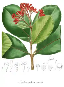 The genus was initially named Ferdinandea by Johann Baptist Emanuel Pohl (but that name was an illegitimate homonym[2]) who placed it in the family Bignoniaceae.[3] This species is a shrub or small tree that occurs at the edge of a swamp in a gallery forest.[4]