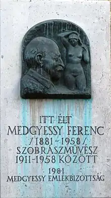![]() Commemorative plaque to Mr. Ferenc Medgyessy (1881–1958) Hungarian sculptor and professor. It is affixed on a studio house of the artists’ colony of the Százados Street in Budapest where he lived and worked between 1911 and 1958. Author of the bronz relief is Mr. Iván Szabó. (Budapest, District VIII, Százados Street Nr 8). | |