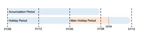 As of 1 September 2020, the holiday scheme in Denmark will conform to the concept of concurrent holidays.[2] Employees in Denmark will accumulate 2.08 days of paid holiday each month (a total of five weeks each year) which, authorized by the new amendment, can be used immediately.[18] Employees will accumulate holiday days over 12 months (1 September – 31 August) and have 16 months (1 September – 31 December) to use at least four weeks of them.[19] Employees should use fifteen days consecutively, equivalent to a three-week holiday during the main holiday period (Danish: 'hovedferieperioden') from 1 May till 30 September.[20]