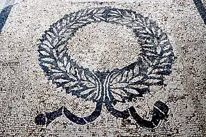 These are the largest baths discovered in the town, excavated in the 1970's. They were built over a housing block (insula) next to the forum. Floors were paved with monochrome mosaics, one with a laurel wreath motif in the centre. In the 5th century a church was built in the atrium. They had a separate, smaller women's section with only a frigidarium and a calidarium. Brick stamps show that repairs were done under Emperor Caracalla (r. 198-217) and some partly coloured mosaic panels were possibly added then.