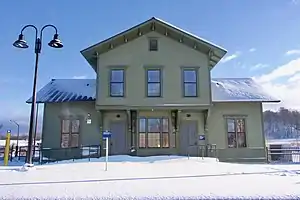 The Vergennes Station House was built about 1851, probably to a design by Vermont architect Gurdon P. Randall. Randall was a protegé of Asher Benjamin, and specialized for some years in the design of railroad-related buildings. It was originally located just north of downtown Vergennes, about 1/3 of a mile south of its present location, on the opposite side of the track and in reversed orientation. It is a two-story frame structure, with a gabled roof at its center and 1+1⁄2-story gabled wings extending to the sides. The front facade is dominated by three arches, the outer of which are blind and closed with clapboard siding, with the center one housing the main entrance. It is covered by a modern standing seam metal roof, with reproduced Italianate bracketing along the eaves and gable edges. It is considered an unusually good instance of early Italianate architecture in Vermont.[12]