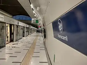 Ferrocarril is an underground metro station of Line 3 of the Santiago Metro network, in Santiago, Chile. It is an underground, between the Lo Cruzat and Los Libertadores stations on Line 3. It is located at the intersection of Manuel Antonio Matta Avenue with Pasaje 4.