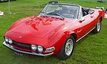 The Fiat Dino was introduced as a 2-seater Spider at the Turin Motor Show in October 1966;[6] a 2+2 Coupé version, built on a 270 mm (10.6 in) longer wheelbase, bowed a few months later at the Geneva Motor Show in March 1967.[7] The two bodies showed very different lines, as they had been designed and were manufactured for Fiat by two different coachbuilders: the Spider by Pininfarina, and the Coupé by Bertone—where it had been sketched out by Giorgetto Giugiaro in 1963 and finished after his departure to Ghia by his replacement, Marcello Gandini.[8] Curiously the Spider type approval identified it as a 2+1 seater.[3] The Spider had poorer interior trim than the Coupé, below par for its class: the dashboard was covered in vinyl, the metal-spoke steering wheel had a plastic rim, and the interior switchgear was derived from cheaper Fiat models.[5] After a few months this issue was addressed, and Spiders produced after February 1967 had a wood-rimmed steering wheel as well as a wood trim on the dashboard like the sister Coupé car had since the beginning.[5] Option lists for both models were limited to radio, metallic paint, leather upholstery, and for the Spider a vinyl-covered hardtop with roll-bar style stainless steel trim.