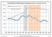 Development of population since 1875 within the current boundaries (Blue line: Population; Dotted line: Comparison to population development of Brandenburg state; Grey background: Time of Nazi rule; Red background: Time of communist rule)