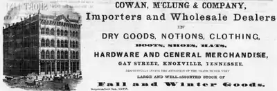 Cowan, McClung and Company was formed in 1858 by the merger of two Knoxville wholesalers Cowan and Dickinson, operated by James Cowan (18011871) and Perez Dickinson (18131901), and McClung, Wallace and Company, operated by the McClung family.[1][3] Cowan was a nephew of Nathaniel and Samuel Cowan, who had opened Knoxville's first general store in 1792,[4] and was a stepson of Thomas Humes, who had established the Lamar House Hotel in 1816. In 1820, Cowan opened his first store, located at the corner of Gay and Main, using money he had borrowed from his mother.[3]