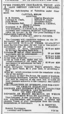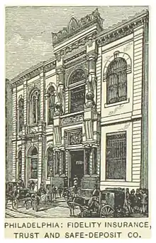 It was founded in 1866 by financier Clarence H. Clark (1833–1906) and several partners as the Fidelity Insurance, Trust, & Safe Deposit Company with initial capital of $250,000. Besides selling insurance and transacting trust business, the company was the second U.S. bank to offer safe deposit services.[1] The bank was located at Broad and Walnut Streets in Philadelphia.[2] The Chestnut Street building was designed by G. W. & W. D. Hewitt - Architects, Frederick S. Holmes - Vault Engineer, and Damon Safe & Iron Works Co. - Vault Builder.[3]