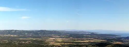 To the southeast hills climb to 320 m (1,050 ft) over the village and enclose the Figari Reservoir, created by damming the Ruisseau de Ventilegne for purposes of water supply and irrigation; additional water can be taken from the Orgone, a small brook which descends from the mountain of Cagna et forms the upper stream of the Stabbiacciu in Porto-Vecchio. To the southwest the commune occupies the east bank of the Bay of Figari, and Ventilegne Point, but not the resort.[3]