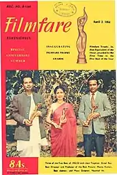 During his term-of-office, Jain started the publication of Filmfare as a fortnightly magazine on 7 March 1952 to "build awareness about filmmaking and films".[6][7] It was launched by Sahu Shanti Prasad Jain and his wife Rama in Bombay,[8] distributed by The Times of India newspaper,[9] and promoted with the taglines, "Another name for 'Credibility'" and "The first serious effort in film journalism in India".[10] It contains short biography of rising actors at the time, film reviews, and a number of columns, including "The Fortnight in Films" and "Filmfacts".[11] Published two months after the 1st International Film Festival of India, Neepa Majumdar (in her 2012 book Global Neorealism: The Transnational History of a Film Style) wrote that the magazine "saw the festival as an opportunity for Indian film [actors] to be exposed to quality films" and established themselves as leading actors.[12] In the first issue, a manifesto was declared: