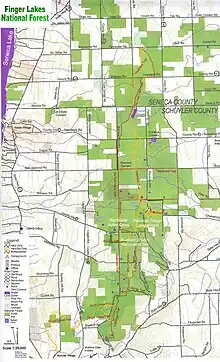 The Finger Lakes National Forest is a United States National Forest that encompasses 16,259 acres (65.80 km2) of Seneca and Schuyler counties, nestled between Seneca Lake and Cayuga Lake in the Finger Lakes Region of the State of New York. It has over 30 miles (50 km) of interconnecting trails that traverse gorges, ravines, pastures, and woodlands.