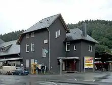 Finnentrop station was established during the construction of the Ruhr–Sieg line from 1858 to 1861 and the station buildings were completed in 1860.[5] Located in the village of Neubrucke, it was called Finnentrop after a nearby estate and the district was given the same name in 1908.[6] The first entrance building was built in 1870. This was replaced by a new building in 1898 because of increasing traffic and then served until its demolition in 1937 as housing for railway families.[5] A locomotive depot was built in the 1870s in conjunction with the building of the branch lines to Olpe and Wennemen. However, only one locomotive was stationed there in 1892.[6] Together with Altenhundem, the station gradually developed into one of the operating centres of the Ruhr–Sieg line. In 1914, after the closure of an on-site locomotive depot at the Finnentrop steel works in 1901, the station’s locomotive depot became an independent depot.[7] In the First World War, a field kitchen was set up next to the station and a medical team was established in the station waiting room.[8] After World War II, 660 people were employed at the station.[9]