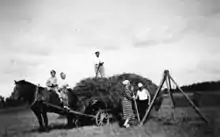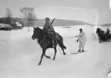 Horses were a central asset to Finnish military forces during the Winter War (1939–40) and Continuation War (1941–1944), when tens of thousands of horses were the main locomotive power of the army due to the shortage of automobiles.[99][100] Animals were procured from private owners in a systematic procedure, but to ensure the continuity of Finnhorse breeding, neither stallions nor any nursing, pregnant or studbook-approved mares were enrolled to be eligible for military procurement.[99][101][102] All procured horses officially remained their private owners' property, were marked for identification and as necessary, were returned or reported dead.[102] The program was successful in preserving the breed, as the horse population rebounded to its pre-war count of over 380,000 animals as soon as 1945.[103]