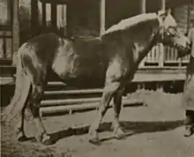 Because of the vigorous colour breeding for chestnut in the early 20th century, combined with a genetic bottleneck resulting from the low number of Finnhorses that existed in the 1980s, colours such as grey and cream dilutions were preserved only by a few minor breeders. In the 1980s there were fewer than ten grey and palomino Finnhorses combined.[9] All Finnhorse carriers of the cream gene today descend from a single maternal line, founded by the palomino mare Voikko (literally, "Palomino") who lived in the 1920s.[20] While both cream dilution and black are rare, there are some known smoky blacks in the breed, the first of which was a filly foaled in 2009, identified as smoky black and confirmed as such by a DNA test in 2010.[21][22][23] The filly is considered "if not the first ever, at least the first in a long long time."[21] In April 2010, a filly appearing to be a double cream dilute was born, sired by a buckskin and out of a palomino. She was blue-eyed and had "pink skin and very pale coat", and was later officially recognised as a double cream dilute.[6][24][25][26][27][28]