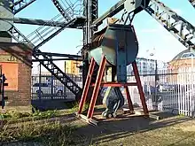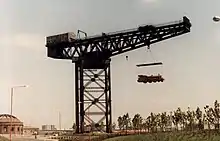 Connected to a spur of the Stobcross Railway, the crane's primary purpose was the lifting of heavy machinery, such as tanks and steam locomotives, onto ships for export.[18] As many as 30,000 locomotives were hauled through the streets of Glasgow by Clydesdale horses, traction engines and diesel tractors, from the works at Springburn to the crane for export to the British Empire.[19] The crane is (as of 1988) not in working order, but is retained as a symbol of the city's engineering heritage.[8][20]
