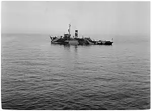 On 2 May 1943 while guarding the mine barriers northeast of Hogland, Turunmaa was seriously damaged in an air raid and the sinking ship had to be beached to shallow water at Haapasaaret (group of islands south from Kotka). Crew casualties were 1 dead and 9 wounded. The ship was immediately refloated and was fully repaired by 23 October 1943.[4][3]
