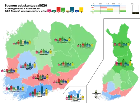 Parliamentary elections were held in Finland on 17 April 2011 after the termination of the previous parliamentary term. Advance voting, which included voting by Finnish expatriates, was held between 6 and 12 April with a turnout of 31.2%.[1][2]
