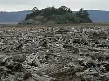 Driftwood deposited by Skagit River floodwaters on the Fir Island shore