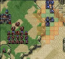 The actions taken in earlier parts of a map can affect later parts of that mission, triggering scripted changes in objectives and enemy behavior: for instance, when a castle is seized, the neighboring castle will deploy additional troops.[5][6] After each battle, a player character gains experience points. When a unit gains 100 experience points, they receive random boosts to their statistics such as health, strength and speed.[3][6] All characters are subject to permanent death if they are defeated in battle, removing them from the rest of the game. If the army's leader is killed, the map must be restarted from a save file, which can be written to at the start of every turn. Victory is achieved upon capturing a specific castle on the map.[3][4]