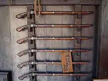 The first documented introduction of the matchlock which became known as the tanegashima was through the Portuguese in 1543.[2] The tanegashima seems to have been based on snap matchlocks that were produced in the armory of Goa in Portuguese India, which was captured by Portugal in 1510.[4] The name tanegashima came from the island where a Chinese junk with Portuguese adventurers on board was driven to anchor by a storm. The lord of the Japanese island Tanegashima Tokitaka (1528–1579) purchased two matchlock muskets from the Portuguese and put a swordsmith to work in copying the matchlock barrel and firing mechanism. Within a few years the use of the tanegashima in battle forever changed the way war was fought in Japan.[5] From 1560, firearms were used in large battles in Japan.[6] In his memoirs published in 1614, the Portuguese adventurer turned author Fernão Mendes Pinto placed himself in that first landing party, although this claim has been roundly discredited and in fact contradicts his claims to be simultaneously in Burma at the time. However, Pinto does appear to have visited Tanegashima soon thereafter.[7]