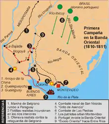 The first Banda Oriental campaign was a military campaign of the Argentine War of Independence, that attempted to capture the Banda Oriental (present-day Uruguay). It took place in 1810–1811. The countryside, led by José Gervasio Artigas, joined forces with Buenos Aires against Montevideo. The viceroy Javier de Elío requested help from colonial Brazil, forcing Buenos Aires to sign a controversial armistice.