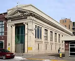 First National Bank is a historic building located in downtown Ottumwa, Iowa, United States. It is significant for its architectural design and its use of terra cotta for the exterior, the only bank in town so clad.[2] Chicago architect H. H. Stoddard designed the building in the Neoclassical style. It was built by the Blackhawk Construction Company in 1915. The building replaced the original 1868 bank building rebuilt after a fire in 1881, also at this location. The two-story structure features a pediment and two columns flanking the main entrance. The exterior is composed entirely of cream colored terra cotta. Dentil ornamentation is found across the top of the building. Initially, the building was a single story with 25-foot (7.6 m) ceilings, but it was altered to its present form in 1956.[2] The glass wall of the main facade was also added at that time. The building was listed on the National Register of Historic Places in 1995.[1]