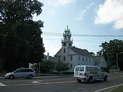 First Presbyterian Church is a historic Presbyterian church at 175 East Main Street in Smithtown, Suffolk County, New York. It was built in 1825 and the sanctuary is a rectangular, two story frame structure measuring 56 feet (17 m) by 34 feet (10 m). It is sheathed in wood shingles and covered by a gable roof. It features an engaged, square tower surmounted by a tiered, balustraded belfry. The tower has a Palladian window at its second level.[2]