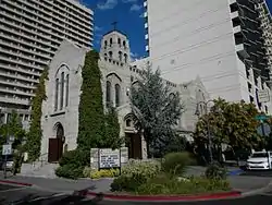 The First United Methodist Church is a Methodist church that was founded in 1868 in Reno, Nevada. In 1868 the first meetings were held in the local schoolhouse on the corner of what is now First and Sierra Streets. In 1871 The first church was erected and dedicated on Sierra Street between First and Second Streets. In the early 1900s the wood-framed church was moved to the back of the lot and a new brick building was added to it. And finally in 1925 plans for a new building were made. Designed by Wythe, Blaken, and Olson of Oakland, the church is one of the first poured concrete buildings in Reno and utilizes Gothic Revival architectural themes. The corner stone for the current historical building was placed in 1926, with the building being dedicated in December of that same year. It was listed on the National Register of Historic Places in 1983; the listing included two contributing buildings. The second building is a parish house designed by local architect Donald Parsons and built in c.1840.[1][2] In 1965 another addition was done to add on what is currently the fellowship hall, and Sunday school class rooms.