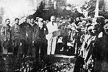 Proclamation of the First Universal of the Ukrainian Central Rada to the people of Ukraine after the prayer service on Sofia Square. Reads Mykola Kovalevskyi. In the center - Mykhailo Hrushevskyi