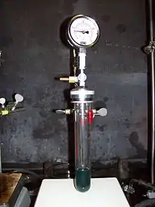 A Fisher-Porter tube or Fisher-Porter vessel is a glass pressure vessel used in the chemical laboratory. The reaction vessel consists of a lipped heavy-wall borosilicate glass tube and a lid made from stainless steel. The lid is sealed with an o-ring and held in place with a coupling.