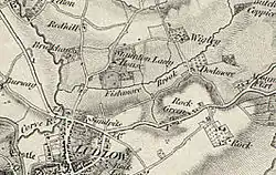Map of Ludlow in 1832 showing that Fishmore Hall was called Staunton Lacy House at this time.