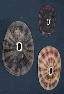 Three shells of Fissurella oriens oriens (museum specimens at Naturalis Biodiversity Center)