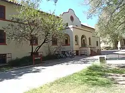 It is a dormitory built of stuccoed masonry. It is rectangular with, projecting from the front, a one-story entry porch that has a flat roof and arched openings. It is California Mission Revival in style. It has curvilinear gables at the buildings' sides. Its roof is covered with mission tile.
