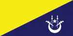 Flag of the Head of Customs and CeremoniesA yellow-blue per bend divided flag with a white crescent and star and two white kris and spears in the bottom right.