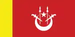 State and war ensignA blue field with a white crescent and star and two white kris and spears in a red canton.