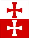 | Design | Rectangle divided horizontally into two stripes, white and red, with red stripe being slightly higher. In each stripe, to the left from the centre, is placed a cross pattée with triangular arms, that is of the opposite colour to the stripe |