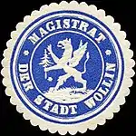 The first known appearance of the coat of arms of Wolin comes from 1301 seal, which depicted a griffin standing below an arch of the city gate, with the gata doors located on its left and right. The seals from 15th century depicted the coat of arms, as a griffin holding a plumeless thistles, with a star below it.[3]