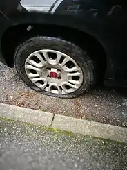 A flat tire (British English: flat tyre) is a deflated pneumatic tire, which can cause the rim of the wheel to ride on the tire tread or the ground potentially resulting in loss of control of the vehicle or irreparable damage to the tire. The most common cause of a flat tire is puncturing of the tire by a sharp object, such as a nail or pin, letting the air escape. Depending on the size of the puncture, the tire may deflate slowly or rapidly.[1]