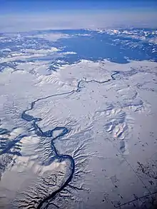 The Flathead River (Salish: člq̓etkʷ ntx̣ʷetkʷ, ntx̣ʷe, Kutenai: kananmituk),[6] in the northwestern part of the U.S. state of Montana, originates in the Canadian Rockies to the north of Glacier National Park and flows southwest into Flathead Lake, then after a journey of 158 miles (254 km), empties into the Clark Fork. The river is part of the Columbia River drainage basin, as the Clark Fork is a tributary of the Pend Oreille River, a Columbia River tributary. With a drainage basin extending over 8,795 square miles (22,780 km2) and an average discharge of 11,380 cubic feet per second (322 m3/s), the Flathead is the largest tributary of the Clark Fork and constitutes over half of its flow.[7]