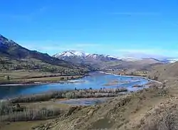 Near Polson the river leaves the natural basin of Flathead Lake, but first passes through Seli’š Ksanka Qlispe’ Dam (formerly Kerr Dam), which raised Flathead Lake's natural level by 10 feet.[11] After flowing through the dam the river turns south and meanders through the Flathead Valley west of the Mission Mountains, and at Dixon it is joined by the small Jocko River. At the Jocko River confluence it turns west, and a few miles after flows into the Clark Fork near Paradise.[12]