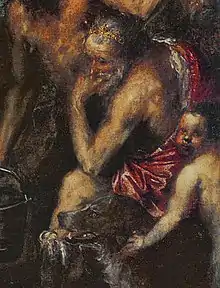 Beyond the purely technical means, many critics have tried to articulate evocations of Titian's pictorial language in this and other very late paintings.[65] According to Sydney Freedberg, "the surfaces of bodies make a silvered incanescence and the atmosphere, almost unbreathably dense, is like dulled fire. ...There is a wry comedy within the cruelty, ugliness and strangeness within the magisterial beauty, and terror accompanies the sense of the sublime."[66] For John Steer "it is not individual colours that tell, but an all-over emanation of broken touches, evoking a greenish-gold, that is splattered, appropriately to the theme, with reds like splotches of blood. Vision and expression are here so much one that they cannot, even for the purposes of discussion, be separated. .... Titian's intense struggle to grasp in paint, through tone and colour, the physical realities of the scene is a fundamental part of their meaning."[67]