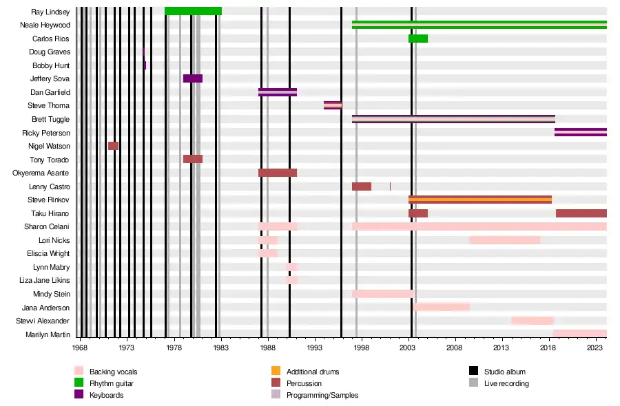 ![]() Fleetwood Mac in 1977. From left to right: Mick Fleetwood, Christine McVie, John McVie, Stevie Nicks, and Lindsey Buckingham. | |