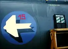 The late Fliegerstaffel 15 (No 5 Squadron) of the Swiss Air Force was active until 1994 and equipped with Hawker Hunter aircraft. The home base of their last service was the airfield at St. Stephan. The Fliegerstaffel 15 carried as their coat of arms a paper aircraft on a blue ground with a red "15". The old badge of the FlSt15 was a black bird of prey with white background and two red circles.