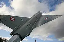 The Fliegerstaffel 16 (Fightersquadron 16) of the Swiss Air Force was last equipped with Northrop F-5 F aircraft. Their home base was Sion Airport. The Fliegerstaffel 16 had a shield-shaped coat of arms showing the side view of a black dragon with a red eye, red claws, and a red firebeam in front of the white digit 16 and a dark blue background. The old badge was the same, but in round design.