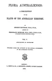 In 1863 George Bentham published the first volume of a seven volume series called Flora Australiensis which included descriptions for 8,125 taxa. This was the first detailed account of Australian flora which included many Western Australian species as the work covered the relationship between many of the larger plant families which occurred across the continent. As Bentham had never been to Australia, he based all his work on the material already collected, assisted by Ferdinand von Mueller Victoria's colonial botanist. Mueller made two visits to WA in 1867 and 1871 to collect material and 1,122 of the Western Australian species described by Mueller are still in use. In 1882, and revised in 1889, Mueller produced a census of WA flora listing 3,560 individual species.[3][9]