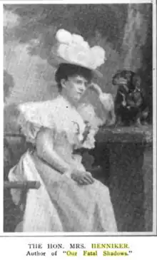 Her first novel, Sir George, was published in 1891, originating one of Henniker's most enduring themes across her corpus, that of heterosexual romantic love failing due to the necessity for strengthening homosocial bonds between men in order to maintain patriarchal social order and control over property and women.[8] Bid Me Good-bye (1892) tells the story of a heroine, Mary Gifford, whose four suitors all prove unacceptable, leaving her single at the novel's conclusion, and liberated. Perhaps Henniker's most daring work, Foiled (1893) depicts a glutted English aristocracy on the verge of collapse, feminizes some of her masculine characters and over-masculinizes others, and presents a society in which men and women live in irretrievably separate spheres. Even when heterosexual marriage does occur, it functions as a socially appropriate, but uncomfortable proxy for tabooed homosexual and incestuous love. Two collections of short stories were published in this period, Outlines (1894) and Contrasts (1903), which included a collaboration with novelist Thomas Hardy. In Sowing the Sand (1898), Henniker makes the case that the advent of romantic love spoils the joys of youth for both boys and girls.[15] Harking back to 18th century novel conventions, Henniker wrote Our Fatal Shadows (1907) as a story told through a series of letters, leading Justin McCarthy of The Independent to term it, "One of the most remarkable novels given to the world here for some time in this age of novel writing."[16] Her final novel was Second Fiddle (1912), which Coulson Kernahan claimed pictures, "truthfully, the fashionable life which has been written about, preached about, gossiped about, and gasped about in the books, sermons, and plays that profess to portray the "Sins of Society."[17]