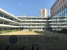 Murray left Seoul in the final years of the 1950s for Gangwon-do, a province that was particularly affected by the Korean War.[6] She decided that Wonju, the provincial capital, was to be the site for a hospital that was jointly financed by the Presbyterian Church of Canada and the United States Methodist Church.[6] Murray was named chairman of the Wonju Union Christian Hospital Board and Building Committee.[12] Murray reconstructed the Swedish Methodist Hospital, built in 1913 by Albin Garfield Anderson. The new hospital groundbreaking ceremony took place in 1957, and in November 1959 the hospital opened with 50 beds.[6] The Wonju United Christian Hospital later merged with Yonsei University to become the Yonsei University Mirae Campus, and it still operates under the name Wonju Christian Hospital.