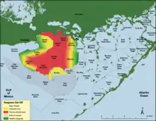 The rerouting of the flow of freshwater to the Bay coupled with periods of drought have caused massive seagrass die-offs.[11] The first major die-off occurred from 1987 to 1991 as thousands of hectares of turtlegrass beds (Thalassia testudinum) were devastated by high levels of toxic dissolved sulfide.[12] 10,000 acres died in the central and western bay, and almost 60,000 additional acres suffered reduced productivity and biomass as a result.[13] Then, following the 2015 drought, extreme temperatures and heightened salinity reduced the amount of oxygen that could remain dissolved in the water, causing periods of anoxia during nighttime and thereby damaging the health of the turtlegrass in the bay. During the summer and fall of 2015, approximately 40,000 acres of seagrass died.[14]