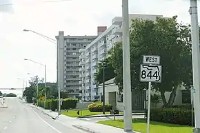 State Road 844 begins at US 1 in Pompano Beach, at the eastern end of the Pompano Beach Municipal Golf Course, with the Pompano Beach Airpark and Pompano Citi Centre nearby on US 1. SR 844 heads east of US 1, passing through an area of apartment complexes and commercial buildings. Two blocks from the eastern terminus of SR A1A, SR 844 crosses the Intracoastal Waterway and passes by more commercial buildings before ending at SR A1A, one block west of the beach.[2][3]
